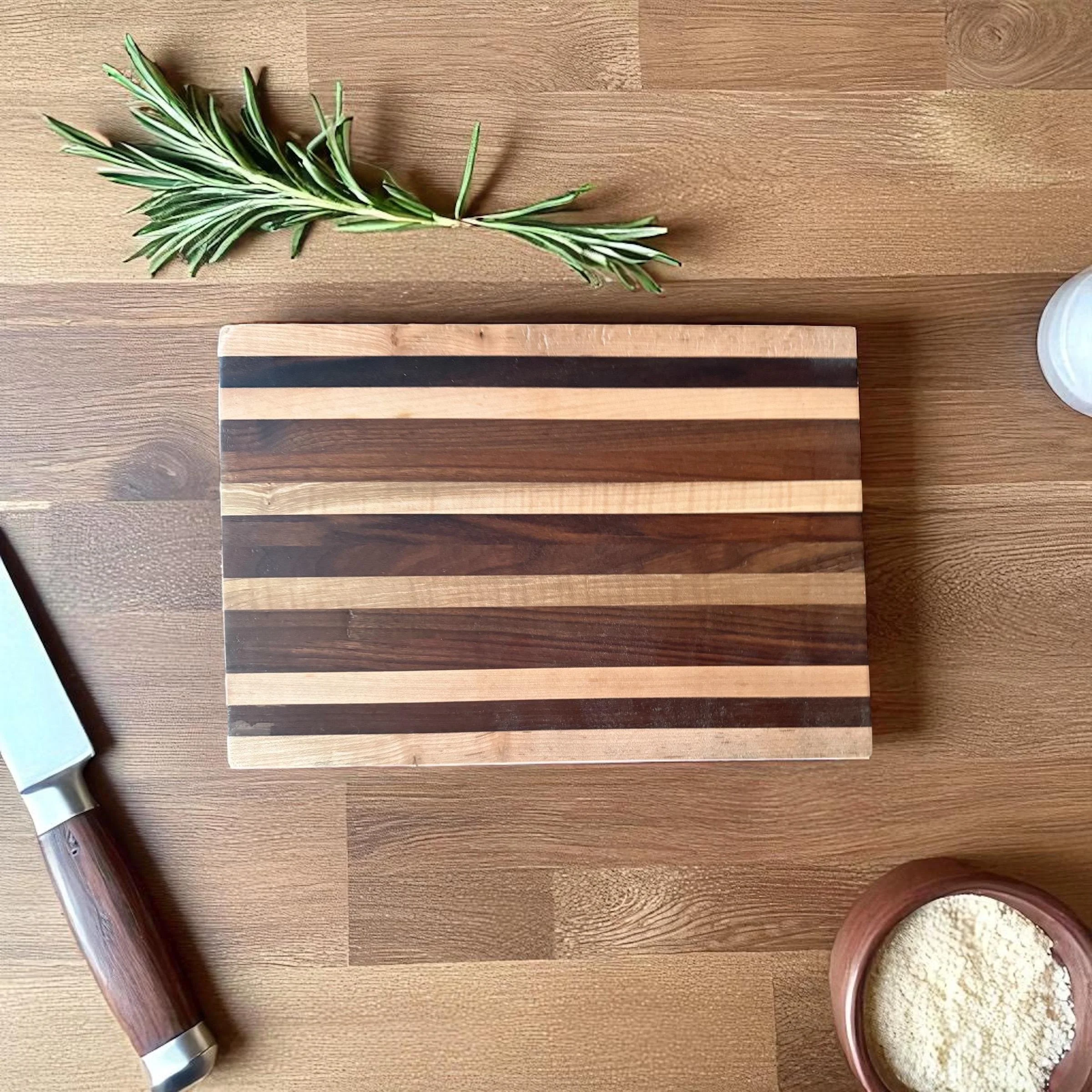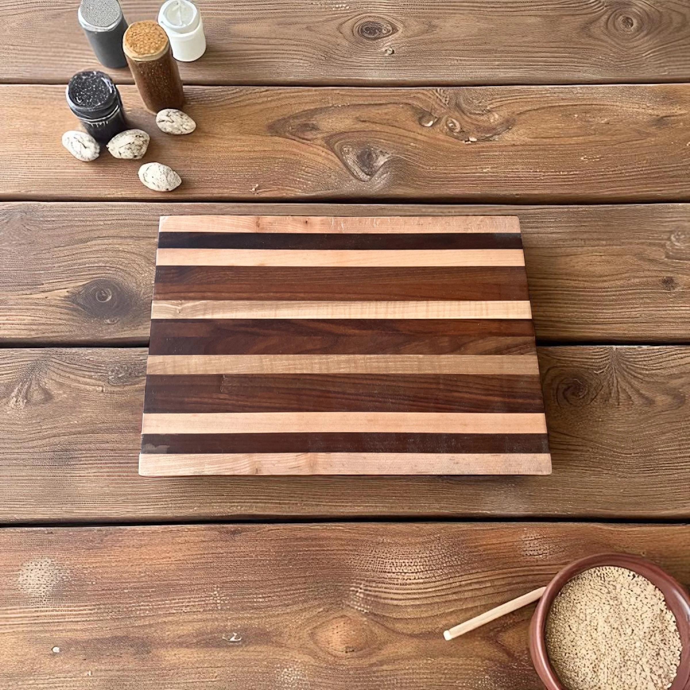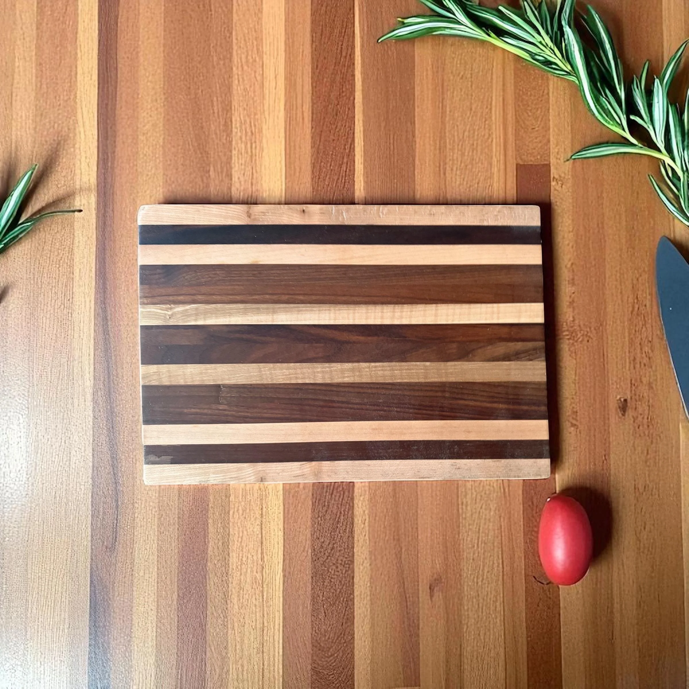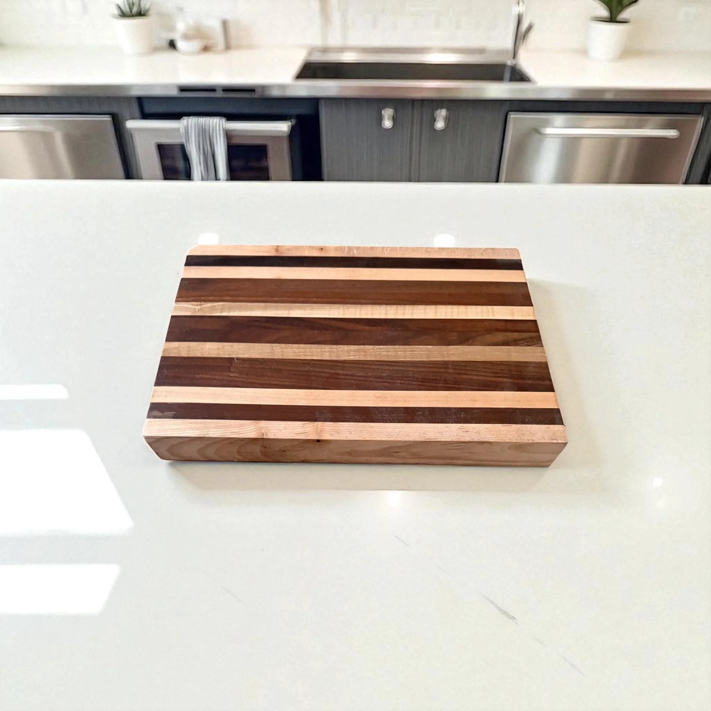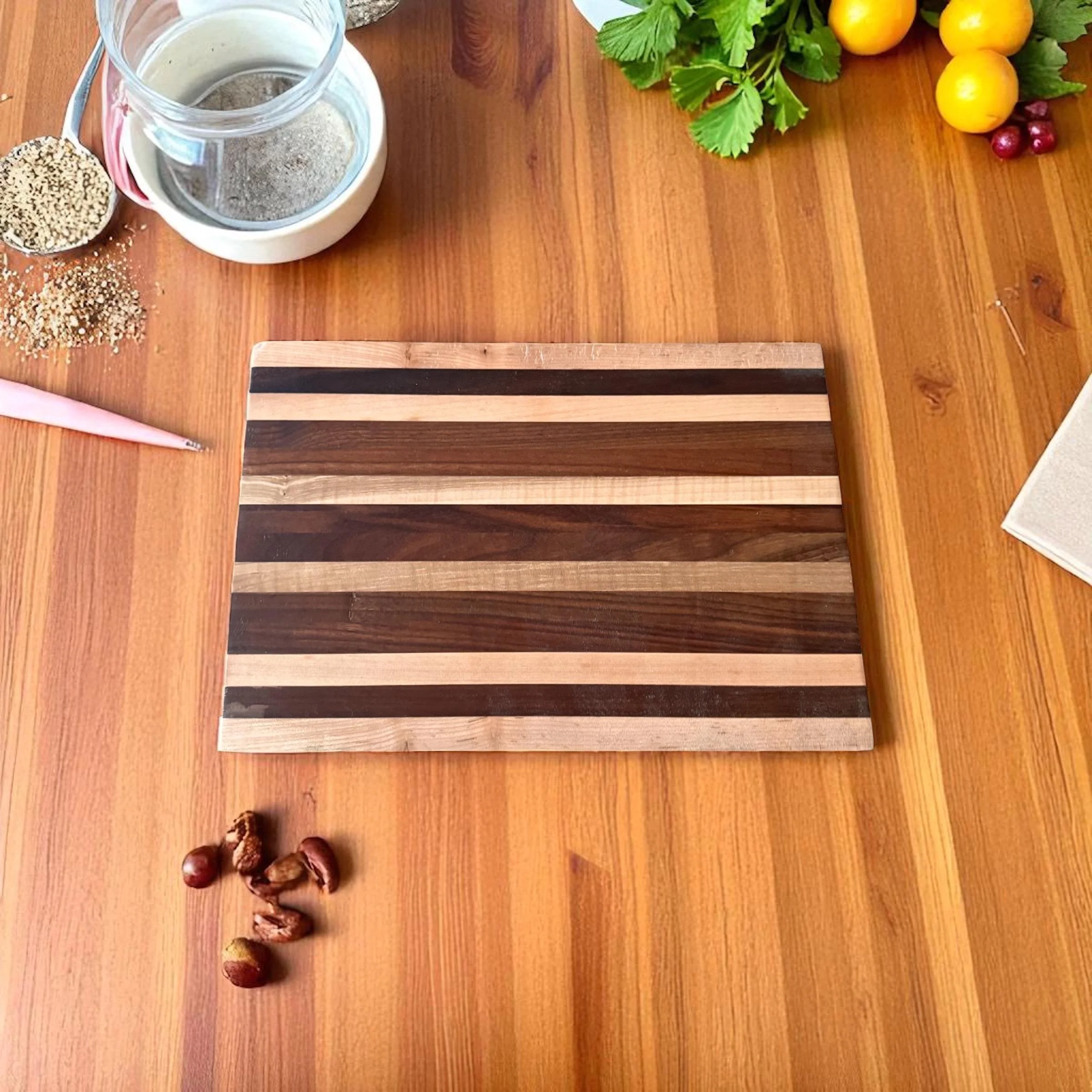 Elevate your kitchen with this beautifully handcrafted cutting board, made from a rich blend of maple, cherry, and walnut hardwoods. Each stripe highlights the natural contrast between light and dark tones, creating a striking yet timeless design that’s as functional as it is elegant.