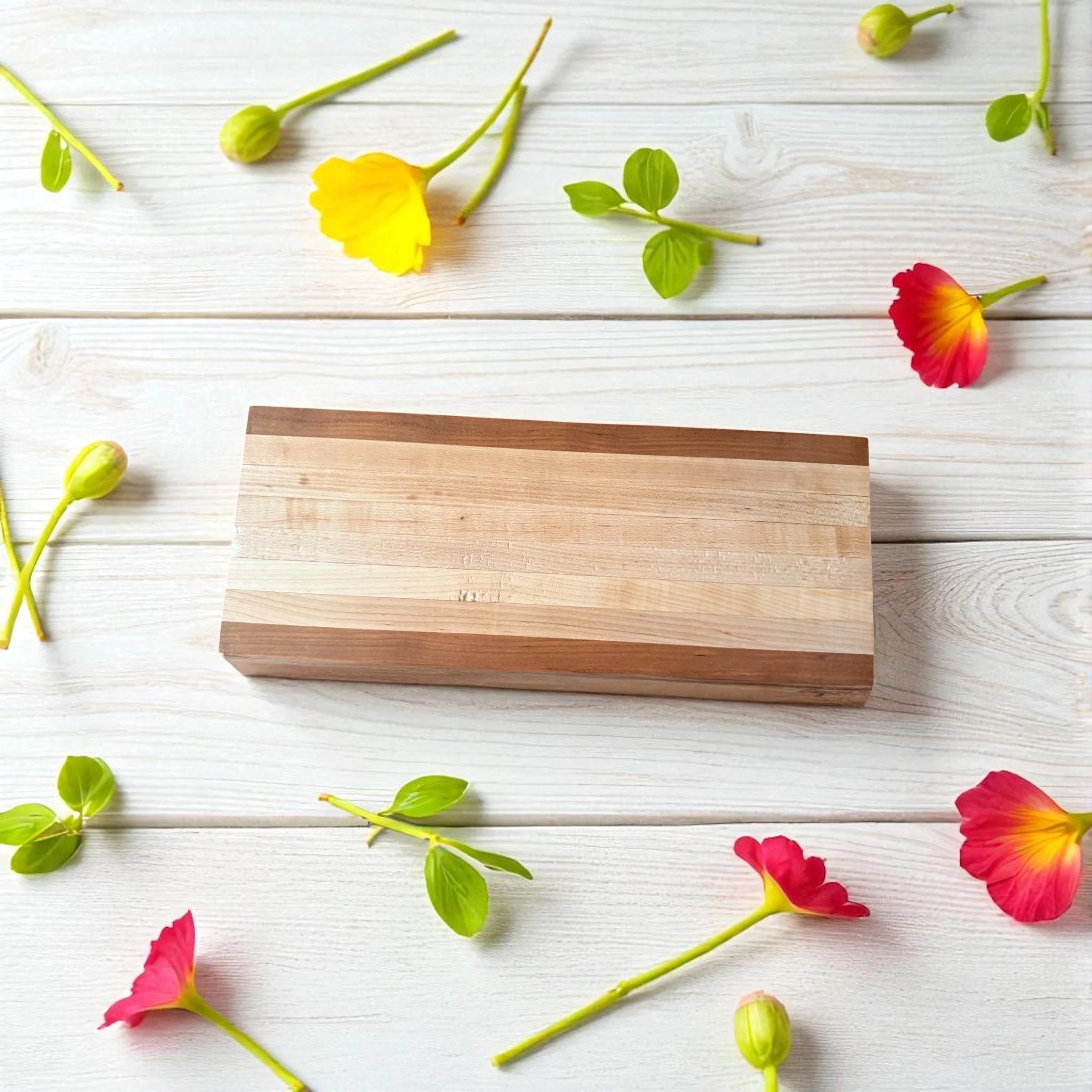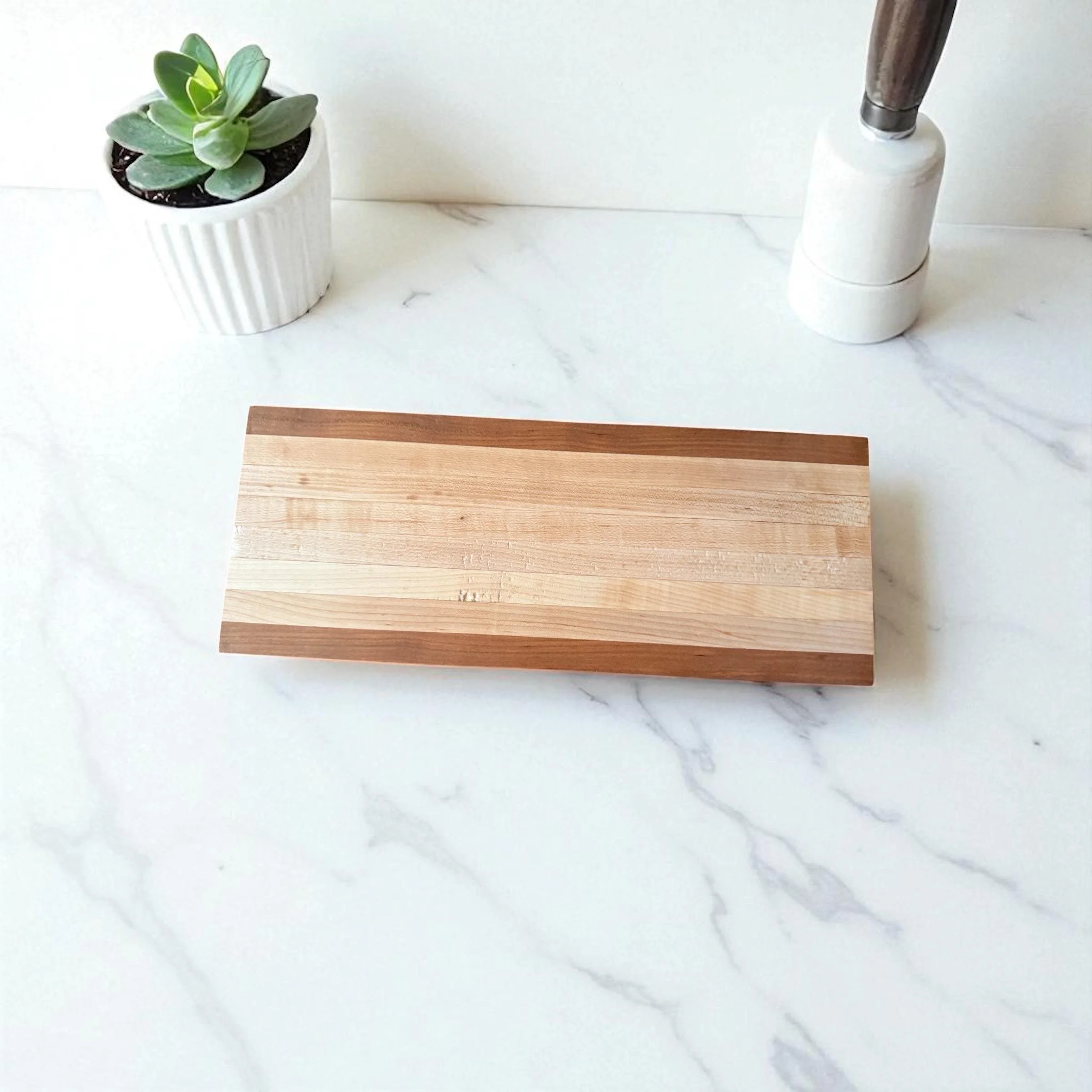✨ Details: • Materials: Maple & Cherry hardwood • Dimensions: 15.5” x 6.125” x 1.75” • Weight: Approx. 7 lbs • Handcrafted, sanded smooth, and finished with food-safe oil