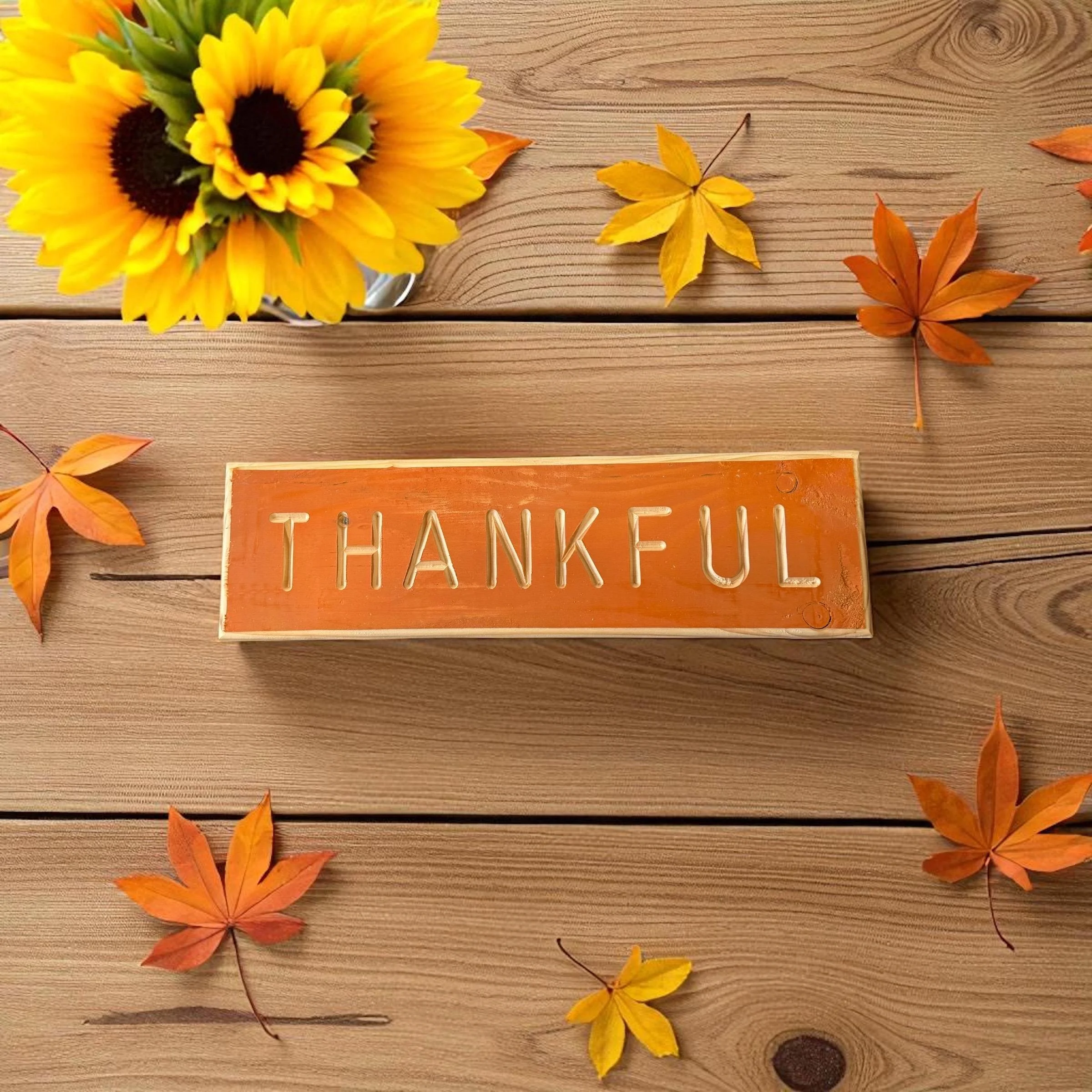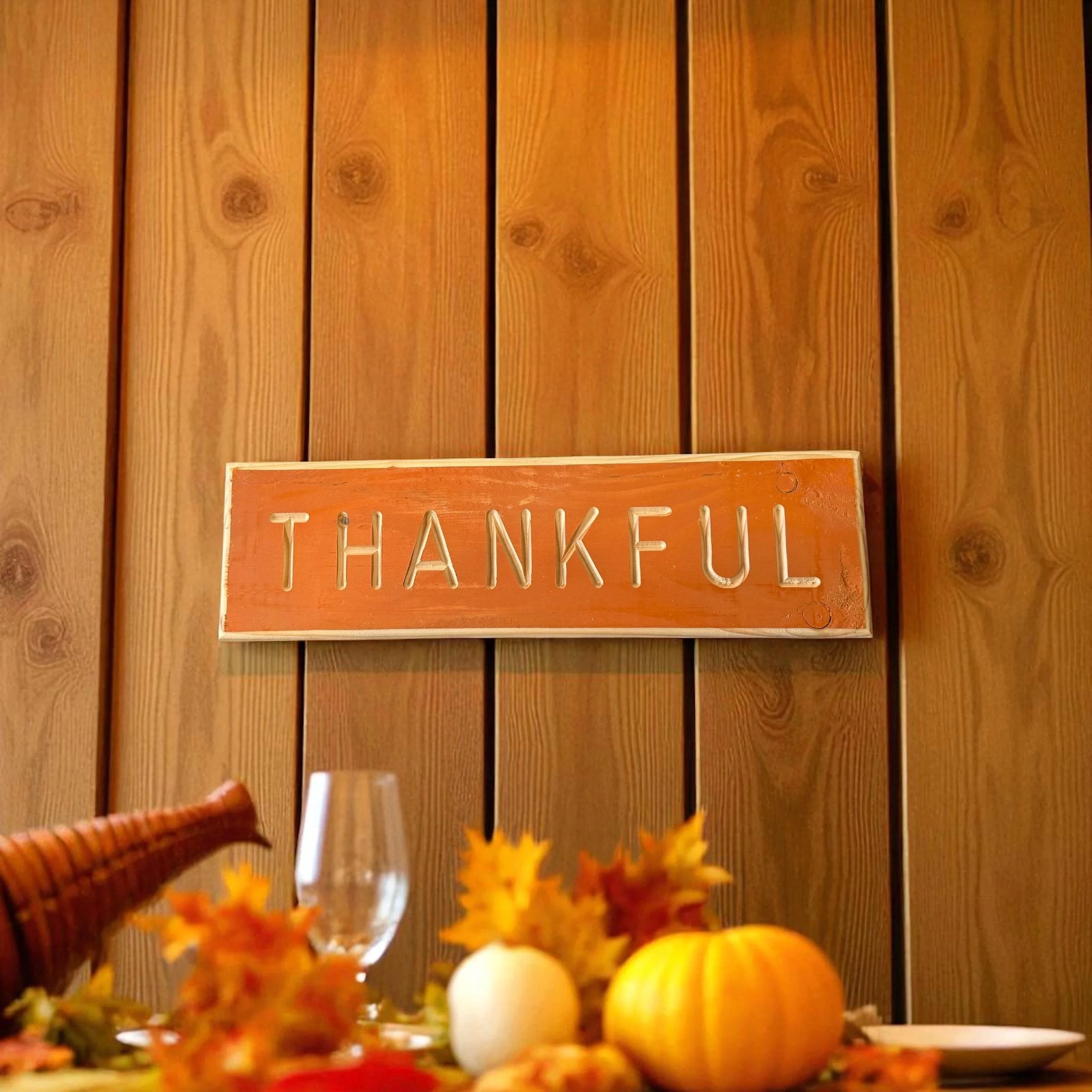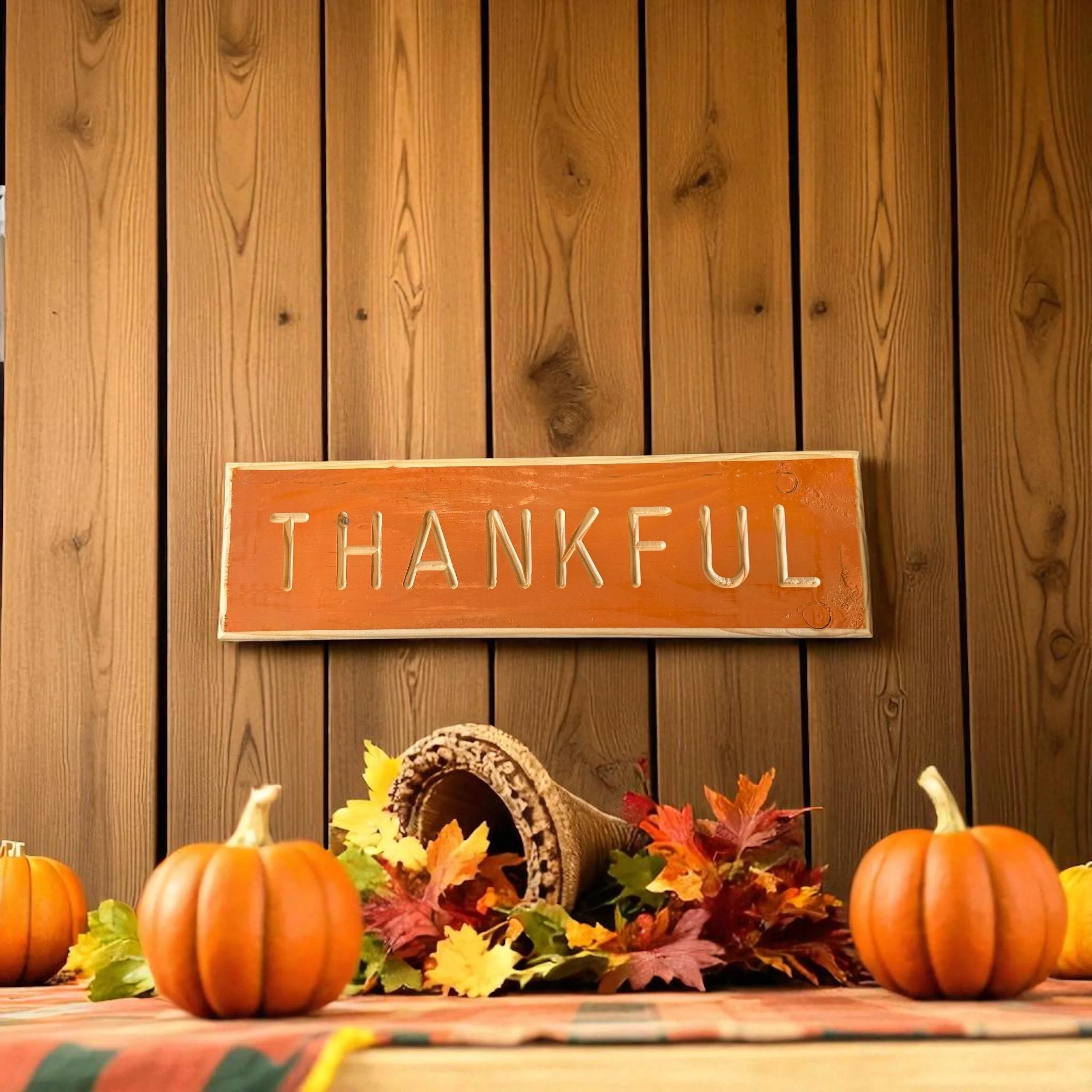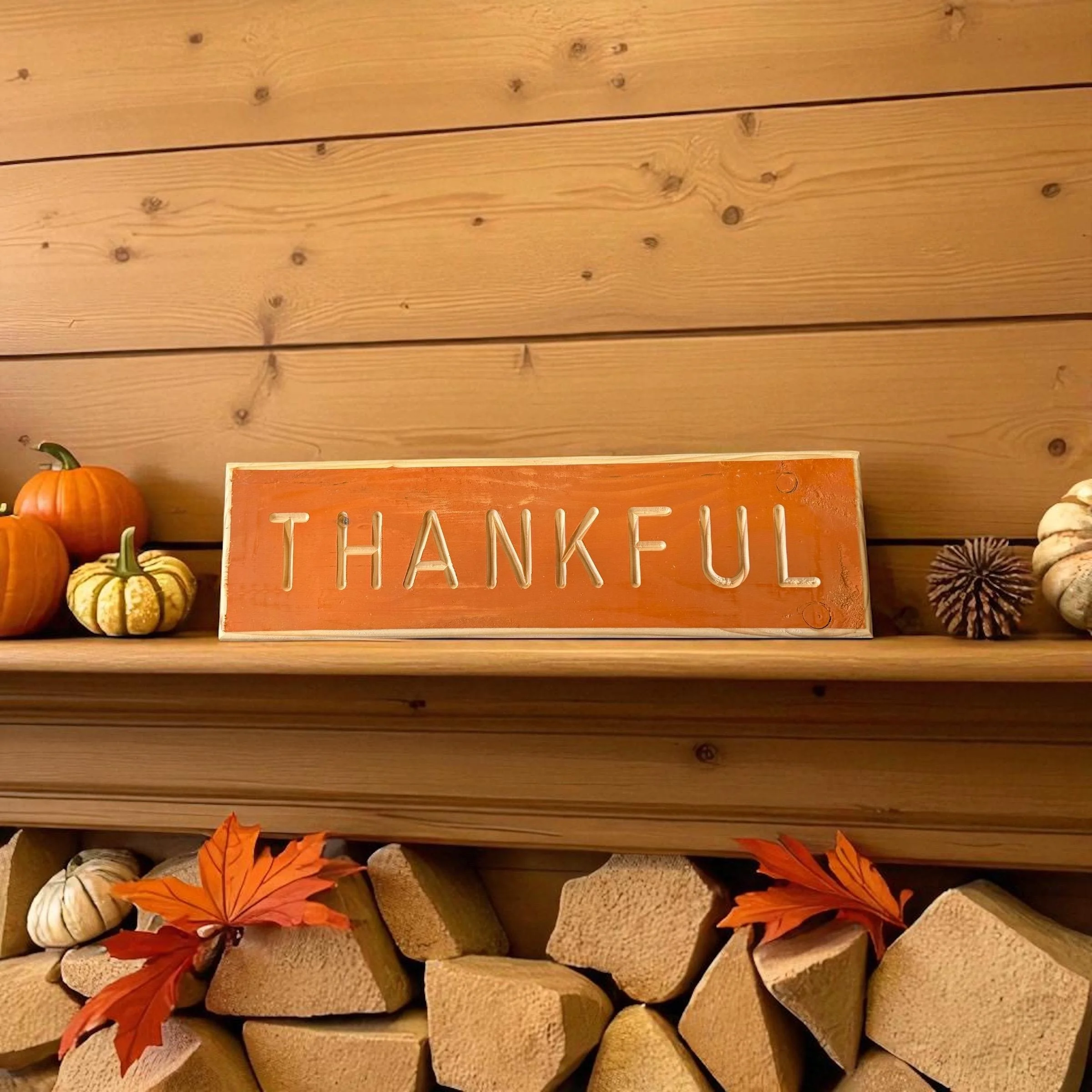 Celebrate the season of gratitude with this handcrafted Thankful wood sign. Featuring raised cream letters on a warm pumpkin-orange background, this rustic piece brings cozy autumn charm to any space. Perfect for Thanksgiving, fall gatherings, or year-round reminders of gratitude.